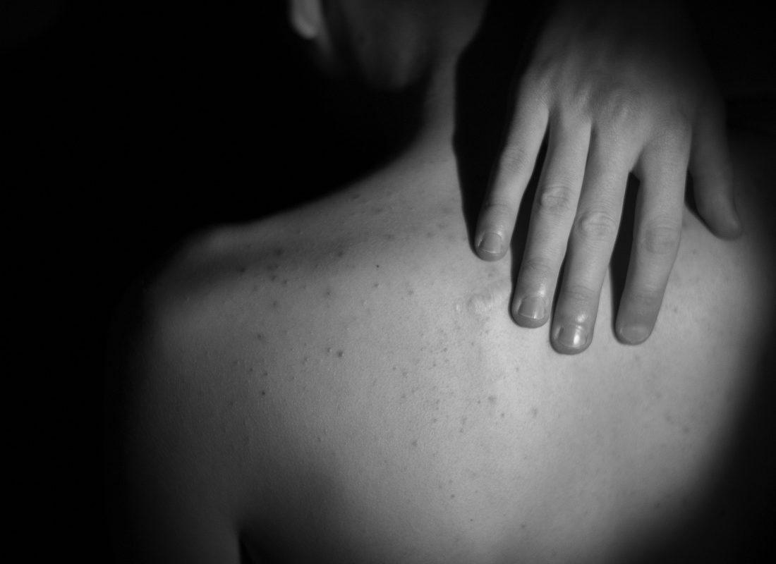 Descripción: RETRATO EN BLANCO Y NEGRO, GESTO CON LA MANO, PERCIBIENDO EL TACTO DE UNA ALTERACIÓN EN LA PIEL QUE NO ES BUENA.